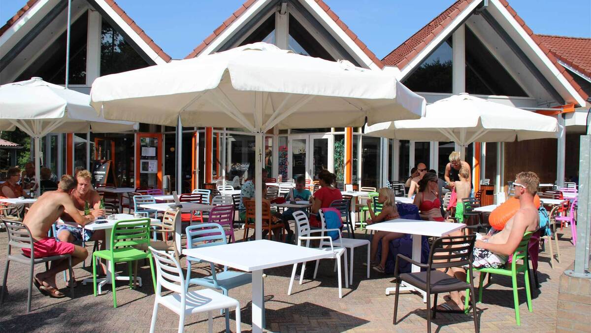 Terwijl de kinderen spelen, genieten ouders en begeleiders van een hapje en drankje bij de snackbar met terras.